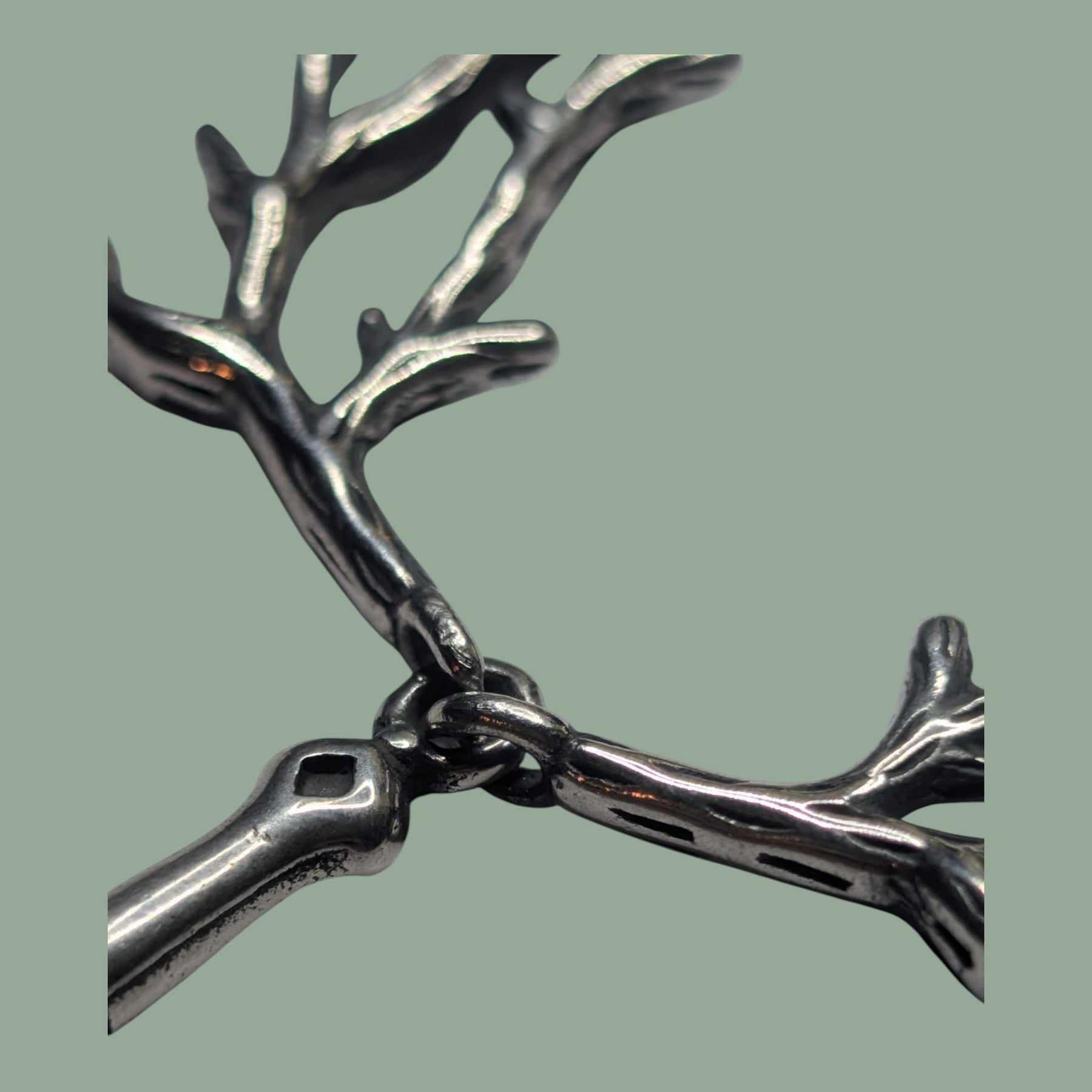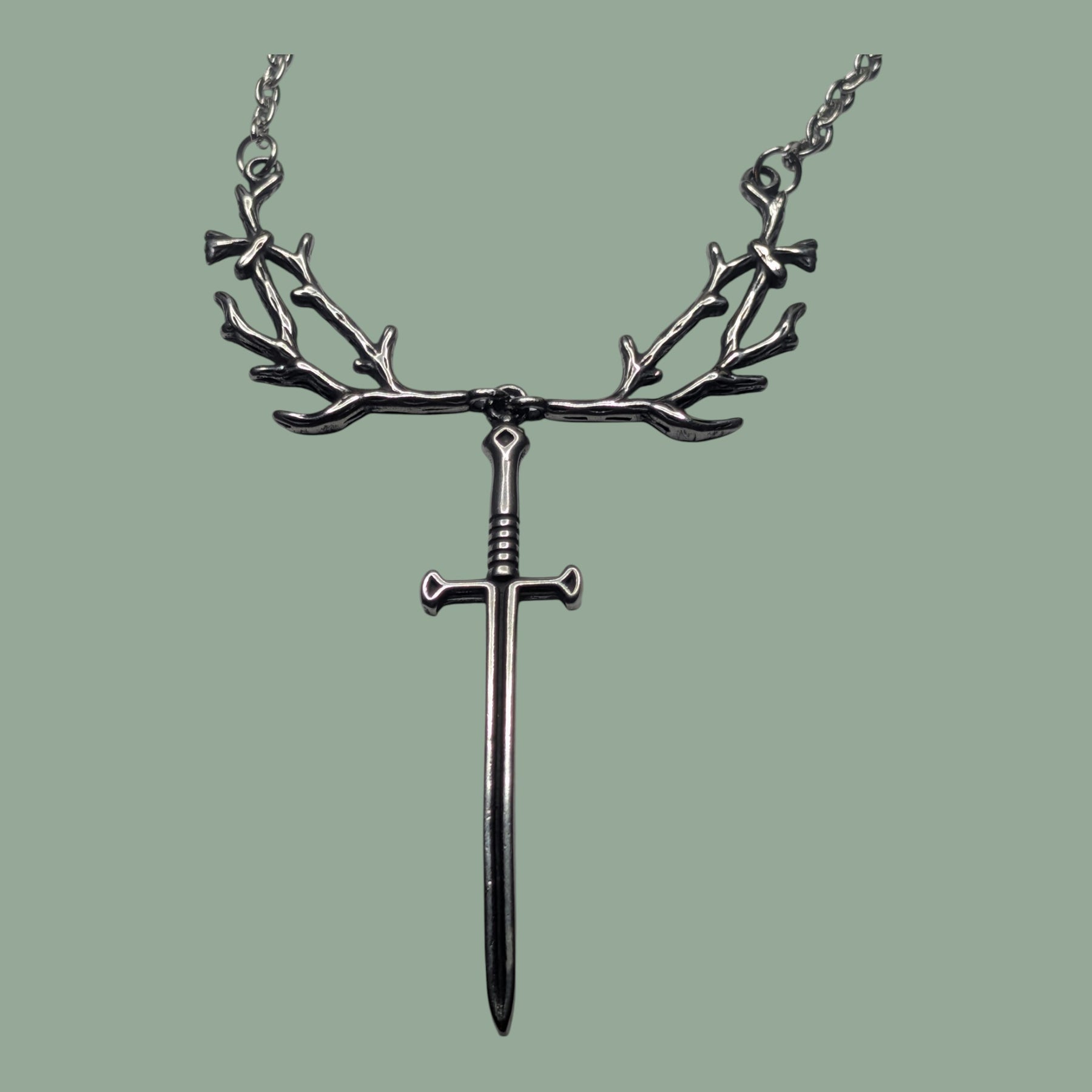 Der Anhänger zeigt ein stilisiertes Schwert, das von zwei Geweihen flankiert wird. Die Geweihe sind an den Enden mit Ösen verbunden, sodass sie sich frei bewegen können und dem Design eine dynamische Note verleihen.