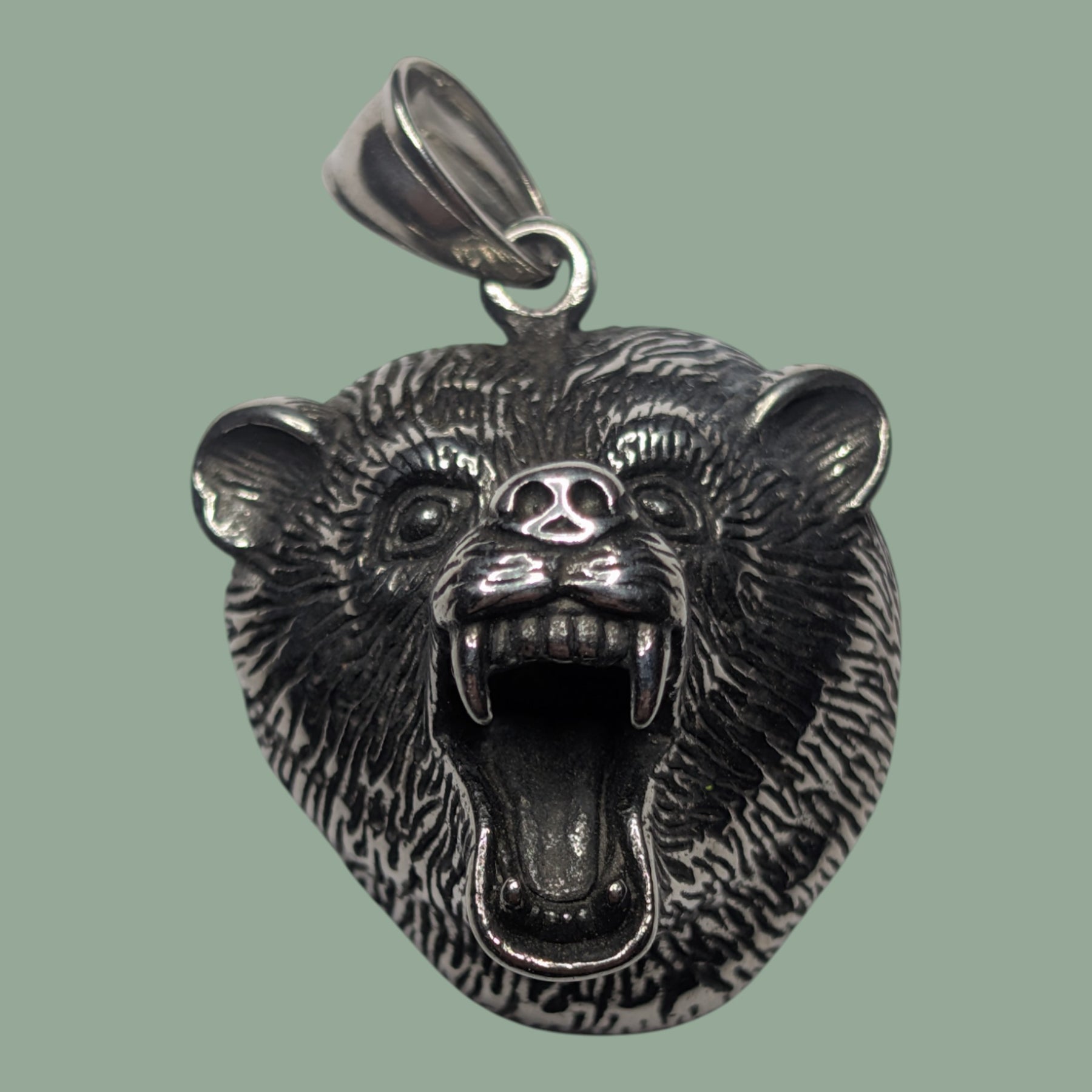 Dieses kraftvolle Schmuckstück zeigt den detaillierten Kopf eines Bären, ein Symbol für Stärke, Mut und Schutz. Der realistische oder stilisierte Bärenkopf ist kunstvoll gestaltet, mit ausgeprägten Merkmalen wie den markanten Augen, der kräftigen Schnauze und den beeindruckenden Ohren.