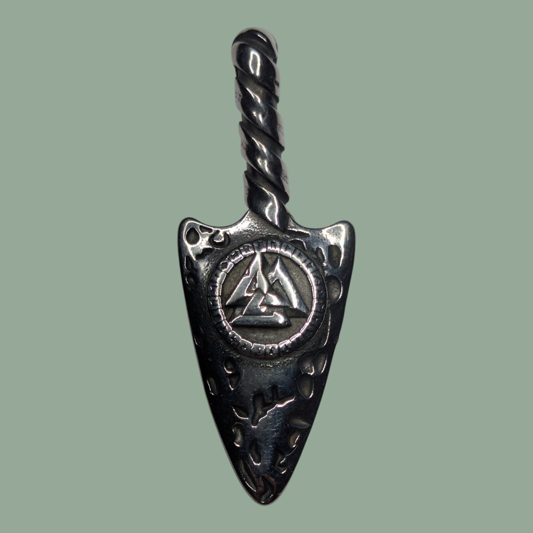 Dieses schlichte Gungnir-Anhänger zeigt den ikonischen Speer des nordischen Gottes Odin, kombiniert mit dem Valknut-Symbol. Der Valknut, bestehend aus drei ineinander verschlungenen Dreiecken, steht für den Übergang zwischen Leben und Tod sowie für die Macht der Götter. Das minimalistische Design verbindet die Stärke von Gungnir mit der symbolischen Bedeutung des Valknut, was es zu einem bedeutungsvollen Amulett macht.
