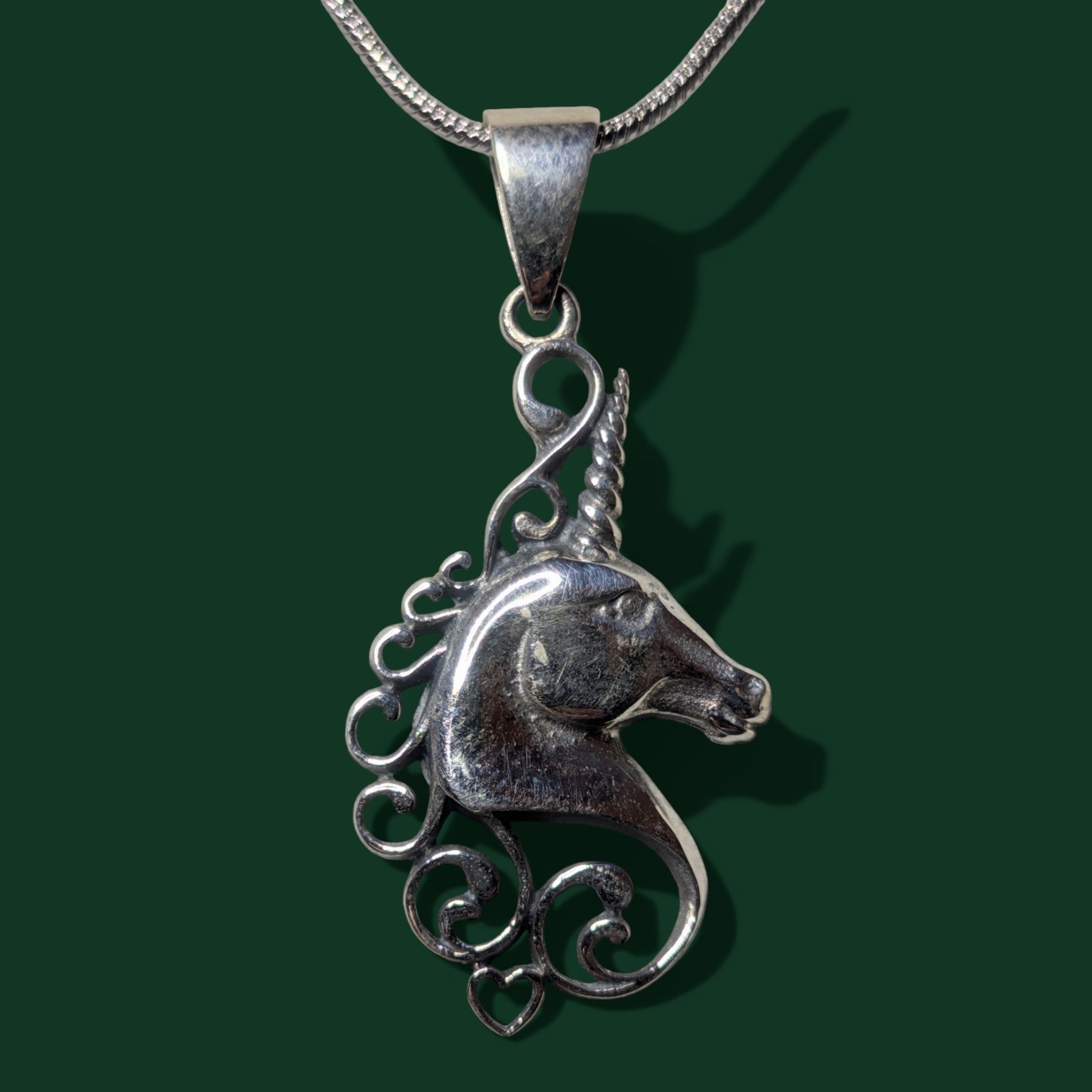 Verleihen Sie Ihrem Look eine zeitlose, mystische Note mit unserer Halskette, deren Anhänger ein fein gearbeiteter Einhorn in hochwertigen 925er ziert. Die filigranen Linien und das Muster strahlen Eleganz und Tradition aus.