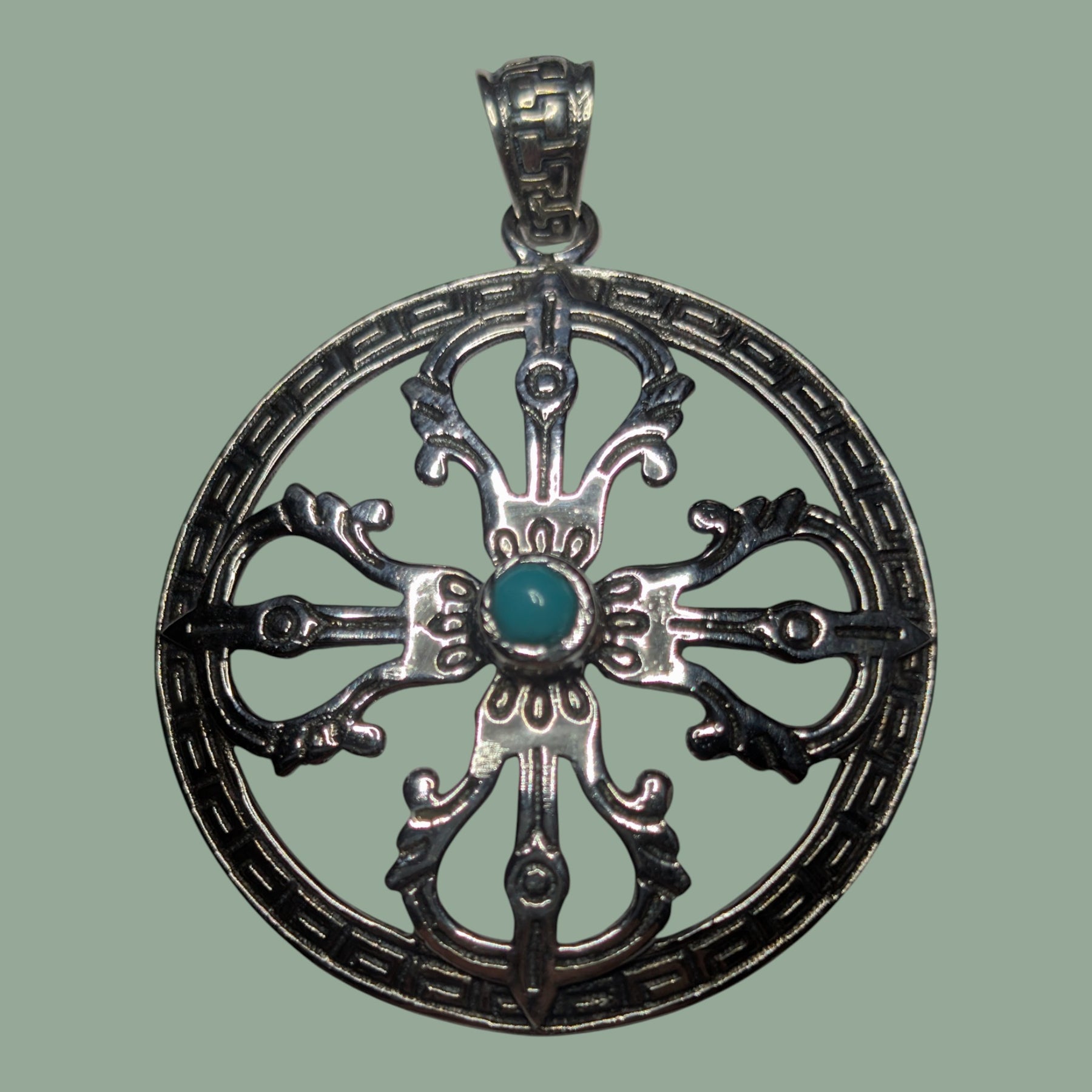 Großer, auffälliger Kettenanhänger aus 925er Silber mit einem kunstvollen keltischen Symbol (z. B. Knotenmuster) als Mittelpunkt. Eingebettet oder begleitet von einem hochwertigen Aventurin-Steineinsatz, verleiht der Anhänger dem Schmuckstück eine mystische Note und stilvolle Vielseitigkeit.
