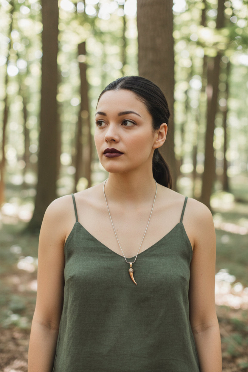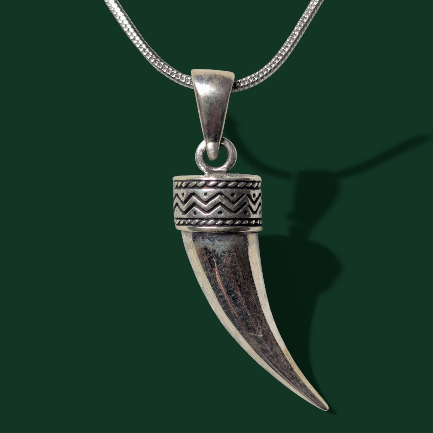 Verleihen Sie Ihrem Look eine zeitlose, mystische Note mit unserer Halskette, deren Anhänger ein fein gearbeiteter Reißzahn in hochwertigen 925er ziert. Die filigranen Linien und das Muster strahlen Eleganz und Tradition aus.